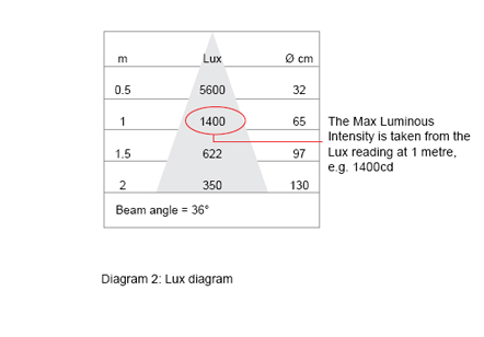 However, the efficacy measurement used for non-directional light sources cannot be transferred to directional ones, as unwanted light needs to be taken into account; glare from the edges of a beam of light, although often not useful light, does contribute to a higher efficacy number. So, with directional light sources an alternative form of measurement is required to show how well a lamp is directing light where it is wanted. The measurement for showing the power of a directional source is luminous intensity (cd). Luminous intensity quantifies the light emitted in a particular direction per solid angle and characterizes the output for a directional light source but this is not easily comparable to lumen per watt. So, EU directive 1194/2012 has defined a method to easily compare the efficacy of directional light sources and asks for a declaration by manufacturers of the useful light being light within a 90˚ cone measured in lumens, this is declared on the packaging and is a simple way to remove stray light from the efficacy number.
